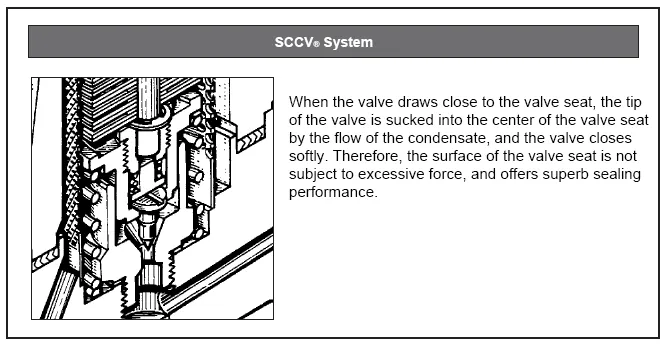 Система состоит из свободно вращающегося клапана, который центрируется и направляется потоком конденсата, идеально усаживаясь в седле клапана даже в условиях экстремального высокого давления. Это существенно снижает износ и эрозию компонентов клапана.